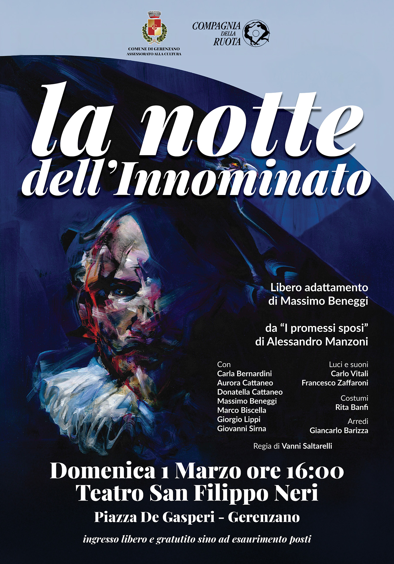 L'Amministrazione Comunale - Assessorato alla Cultura di Gerenzano invita tutti domenica 1 marzo alle ore 16:00 presso il Teatro San Filippo Neri in Piazza De Gasperi allo spettacolo teatrale "LA NOTTE DELL'INNOMINATO", un intenso atto unico, liberamente tratto da "I promessi sposi" di Alessandro Manzoni, proposto dalla "Compagnia della Ruota" di Saronno.